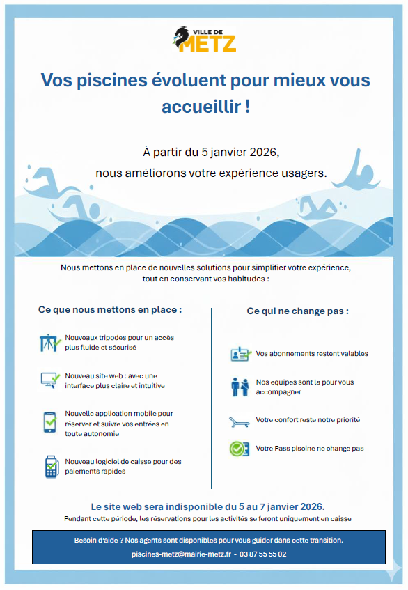 ▲ Un nouveau numéro de téléphone pour contacter les piscines : 03.87.55.55.02 (du lundi au vendredi, de 8h à 12h et de 13h à 17h).